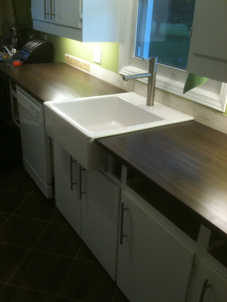 Usually I underestimate the amount of time something will take the two of us, but this time things actually went pretty smoothly.  By the time I had the countertops stained and sealed, Aaron had the old tops out, the cabinets altered for the new sink(which is meant for new cabinets that are a few inches deeper than our originals-but it still worked), and was ready to install the new tops.  By Sunday evening we had everything installed.