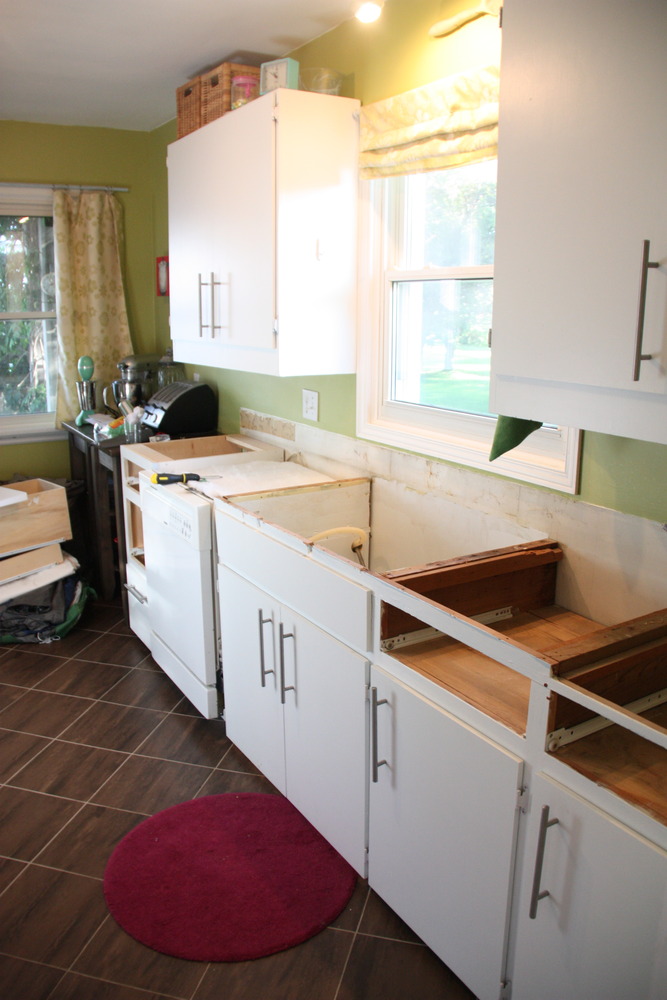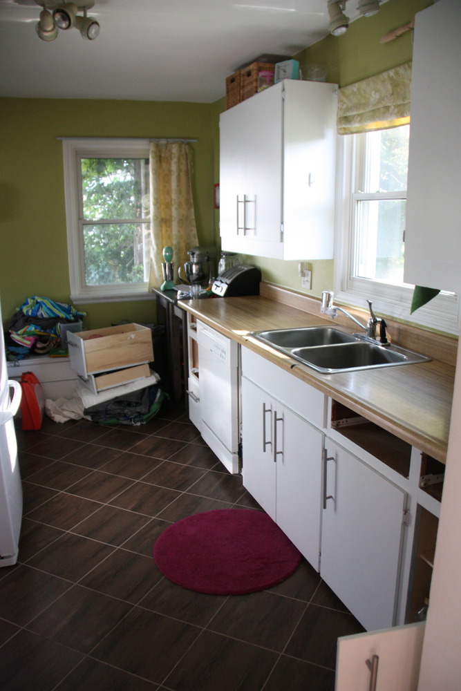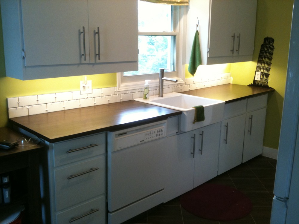 I was really happy with the results and with the fact that our kitchen went from blue cabinets, mint green walls, a white and pink vinyl floor, and a fake wood Formica countertop to what it is now for less than $1000!