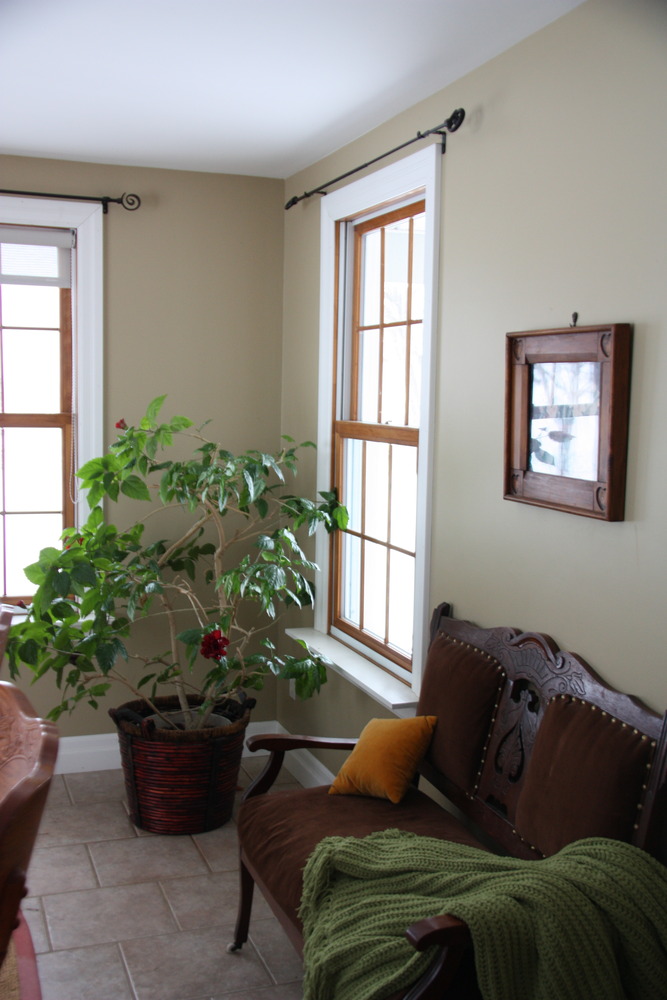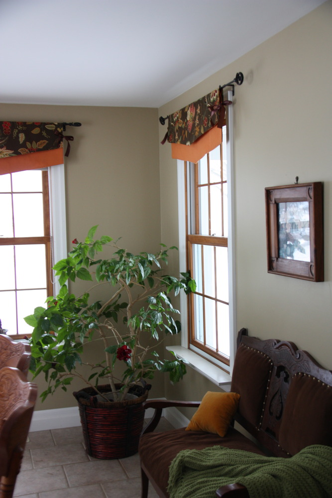 There is a before and after of one corner of the kitchen/dining room and it was so perfect when we went out to secretly hang the valances, she had the little sofa all set up with a co-ordinating pillow and throw.