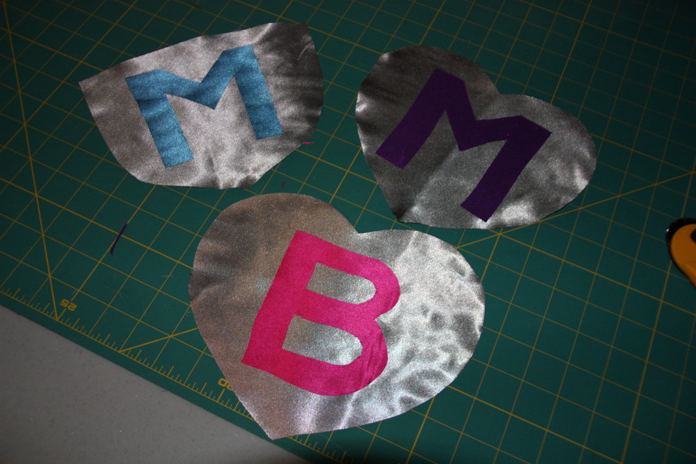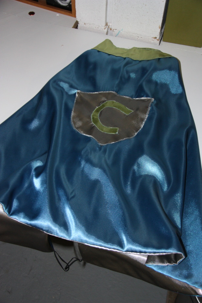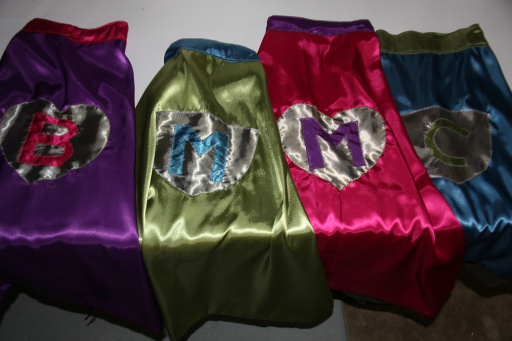I made each of the kids a different colour and for the girls I put a heart with their initial on it on the back and for the boys I put on a crest with their initial on it. I used satin which I found on sale at Fabricland and used velcro on the collar to keep it closed. There are also elastic wristbands attached at the corners of the bottom of the cape to aid in “flying”. I made them all the same size except for the littlest which I made a little shorter.