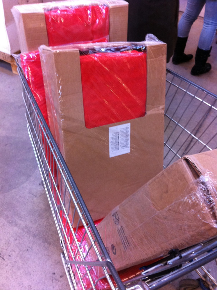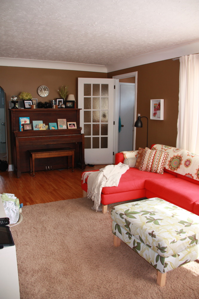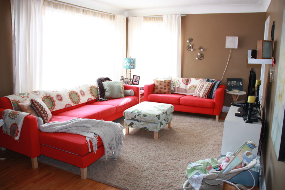 A couple of weeks ago, Myles, Sharlet and I set out on a Wednesday morning at 7:30 am to Ikea Burlington.  The were offering slipcovers for our sofas for only $5 for that day only!  They were only available in red at that price but this would mean that I could have all of my mismatched Karlstad sofa components the same colour and in the same room!  Like I said- I probably wouldn’t have chosen red BUT the regular price for these covers(or the green which I would have preferred) for my combination of sofas would have been $768 and I paid only $15 for the 3 pieces!  Insanity.  It was a little insane getting them too-I had to battle a few people which is why I was extremely grateful to Sharlet for coming along and staying with Myles in the car.  Anyway, once I got home I gathered everything in the house that would help the red fit in a little better; quilts, pillows, blankets etc. that I already had and that would help tone down the colour.  Aaron helped me move furniture around and get the covers on the next day and we got everything all set up.