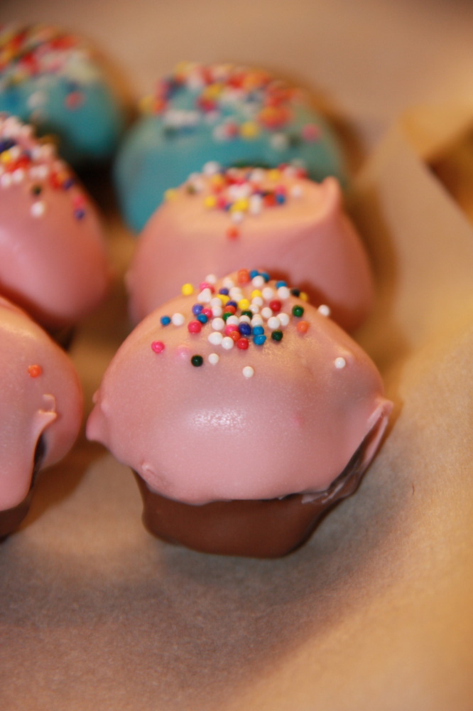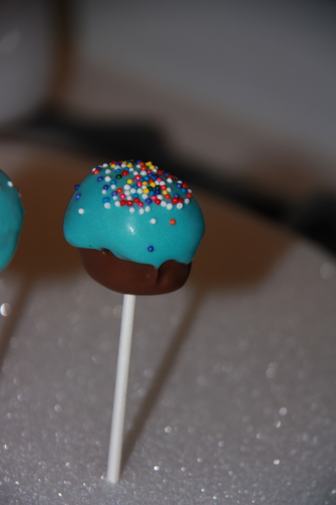 I also decided to try out some cake-pops since they are so popular and since there is a really easy recipe to make them on Bakeralla’s blog. I used chocolate fudge store bought mix for the pops as well as store bought icing because I figured I might mess them up anyway and didn’t want to be upset about scratch cake and icing being ruined. I was right- I did add too much icing, but they still turned out alright, just were more difficult to shape into the cupcakes I was trying to create. I won’t go into much detail about how I made them because there isn’t really a whole lot of detail and because you can find a plethora of recipes/info/youtube videos on how to make them online- but the basic idea is bake a cake, turn cake into crumbs, mix crumbs with icing, roll into shape, refrigerate, cover in chocolate or candy. They were a fun experiment and would be great for a kids birthday party etc.