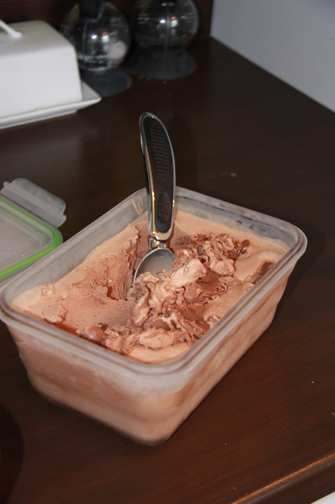 The Chocolate recipe called for homogenized milk, heavy cream, sugar, eggs and melted chocolate. Everything was cooked, cooled and then put in the machine for around 30 minutes. When it came out it was the consistency of soft serve so I stored it in a glass dish and waited until it was firm. It froze really well and scooped nicely. This is what it looked like.