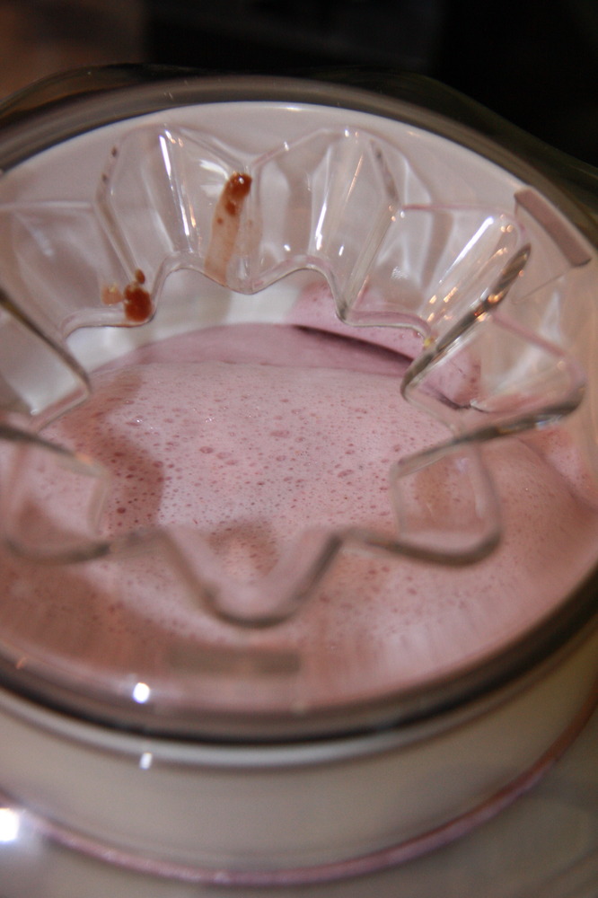 I mixed the ingredients in a blender and poured it straight into the machine. I let it go for the same time as the chocolate and it was about the same consistency at that point. I think it would have been really good to eat right then, but I put it in a glass dish and further froze it. Turns out the eggs really do make a big difference. The berry tasted really good, but it had more of an icy consistency to it instead of creamy. It was much harder to scoop as well. This mix might have made really good popsicles or also would have been good if eaten right away. It was much quicker though so if I was ever doing this with Myles for quick fun when he is older I would probably just do it the same way. If you want real ice cream though I would go with the cooked version.