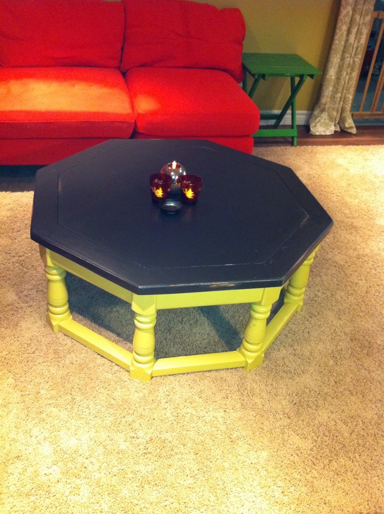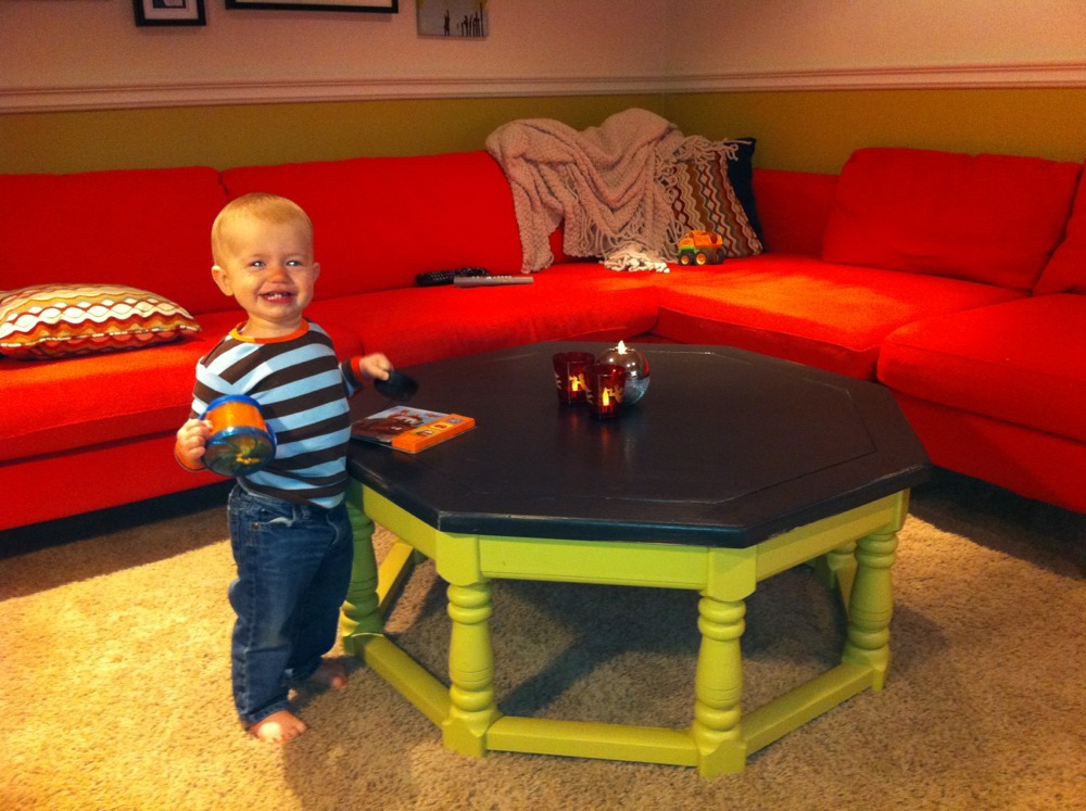 We spend a lot of time in our basement now that it has been redone. All of Myles’ toys are down there so during the day that’s where we are and at night it’s the furthest place in the house from Myles’ bedroom so we can watch movies etc. and know that we won’t wake him. If we happen to get Myles to bed extra early we bring our dinner down to the couch and watch something on tv while we eat so we thought it would be nice to have a surface that we could eat off of as well as play board games on etc.