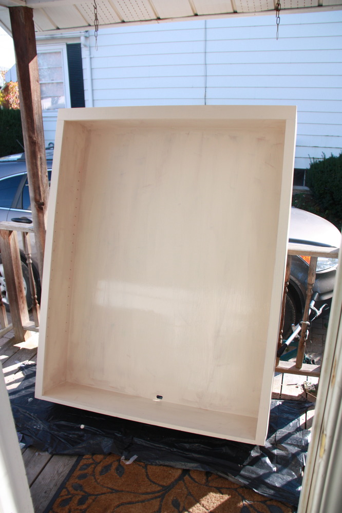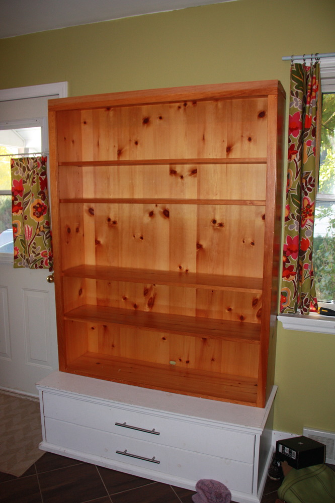 Another project that I sort of had stock piled from last fall was a cabinet in our kitchen. My dad made it in the 90’s for my sister and I aquired it when we moved into this house. We had been using the shoe cabinet portion of it for a while and had painted it the same white as the cabinets and used matching drawer pulls but the upper bookcase portion had sat in the attic untouched. I was hoping to gain some extra storage space in our small kitchen. Our small appliances were taking up space in our cabinets or else were stored in the basement where I never touched them. I wanted a place where they would be easily accesible. When we brought the bookcase down to see if it would fit okay, it looked like this:
