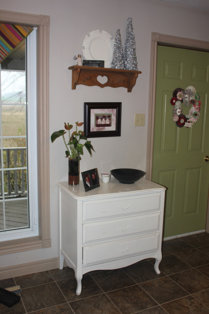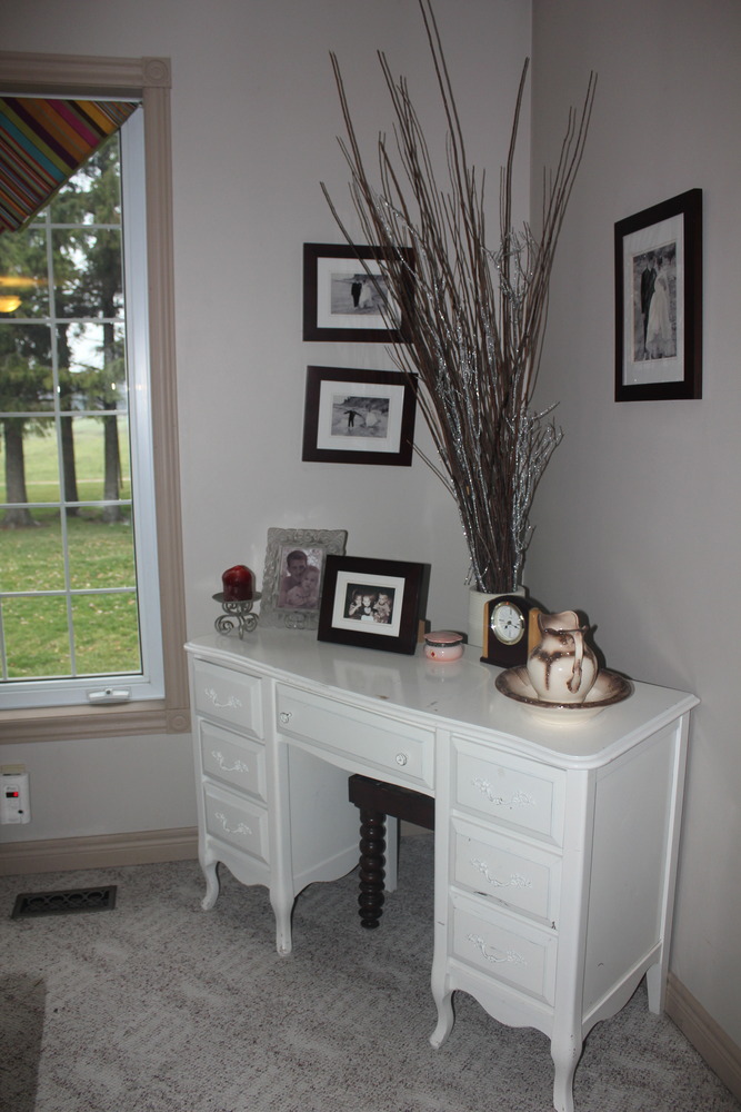 A couple of weeks ago Aaron’s sister came across a matching desk and dresser that had been painted white and asked if I had any fun ideas on what to do with them.  Since I know she is open to bright colours, I suggested turquoise.  She has some window valances in the room with lots of vibrant colours in them including turquoise so I thought it would be nice to bring that colour out.  I also suggested putting a black glaze over top.