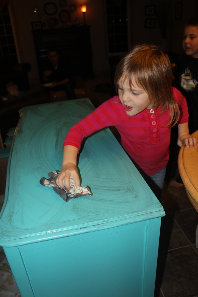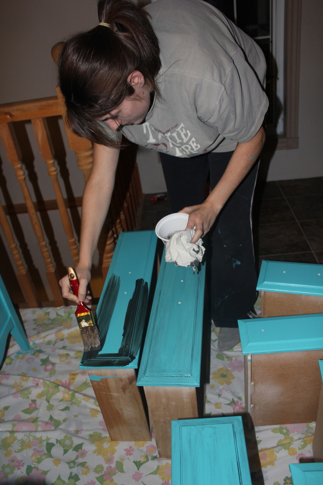 We then primed the pieces and once that was dry we painted them the turquoise we had chosen(Benjamin Moore Aqua Blue I think). It took a couple of coats in some areas because of the detail.  After the paint was dry we got a bit worried because neither of us had ever done a glaze or knew how to do one.  We figured it couldn’t be too difficult though, so we mixed some black paint with water, brushed it on, and then immediately wiped it off with a rag.  It worked!  I don’t actually know if this is how you are supposed to do a glaze but it gave us the desired effect and it was very easy to do.  So easy in fact that five year old Marlee helped us!