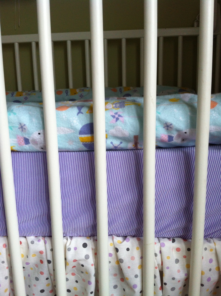 I moved Leah’s crib into our room a couple of weeks ago so I could do some rearranging in Myles’ room and since it seems she will be in our room for a while yet(unless of course it becomes her room in which case she will be in there permanently-more to come on that down the road). I bought some fabric at joann’s the last time we were in port Huron and made a simple bedding set for Leah’s crib. I was going to buy a more femenine coloured fitted crib sheet from Target for her bed but then noticed they had an entire toddler bedding(aka crib bedding with a pillow case and flat sheet) for a couple bucks less than just the crib sheet. So I bought that instead. I wasn’t going to go with purple but that is what it came in and I’m cheap thrifty, so I changed my plans and found fabric to coordinate with the purple.