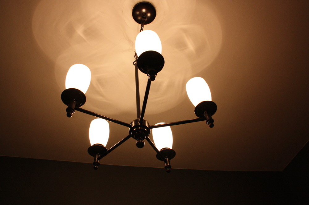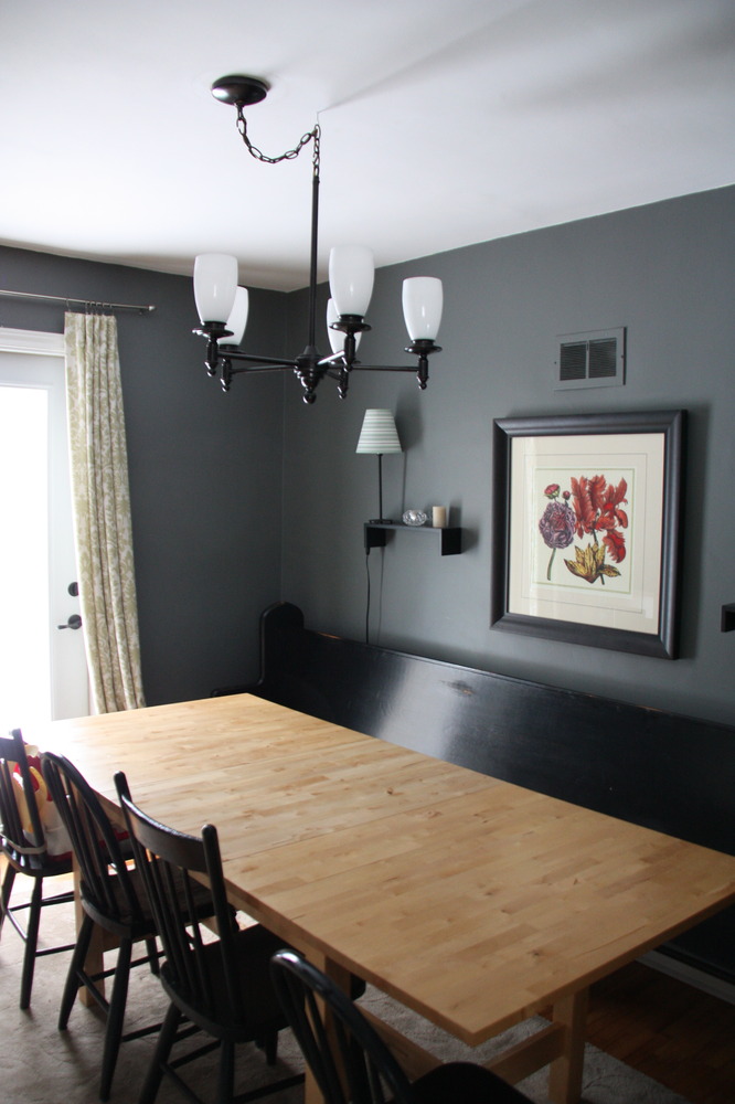 When we got home I broke out the Rustoleum Oil Rubbed Bronze paint and went to work. I’m still kind of getting used to spray painting so the finish didn’t turn out perfect but it looks a heck of a lot better than it did brass and the light fixture as a whole is a large improvement over the unidentified flying object that was there before! We did make use of the chain to string it over half a foot or so, so that it was centered over the new location of the table. After Aaron got it all hung he installed a dimmer switch that he had kicking around in the basement and now we have a dimmable light!