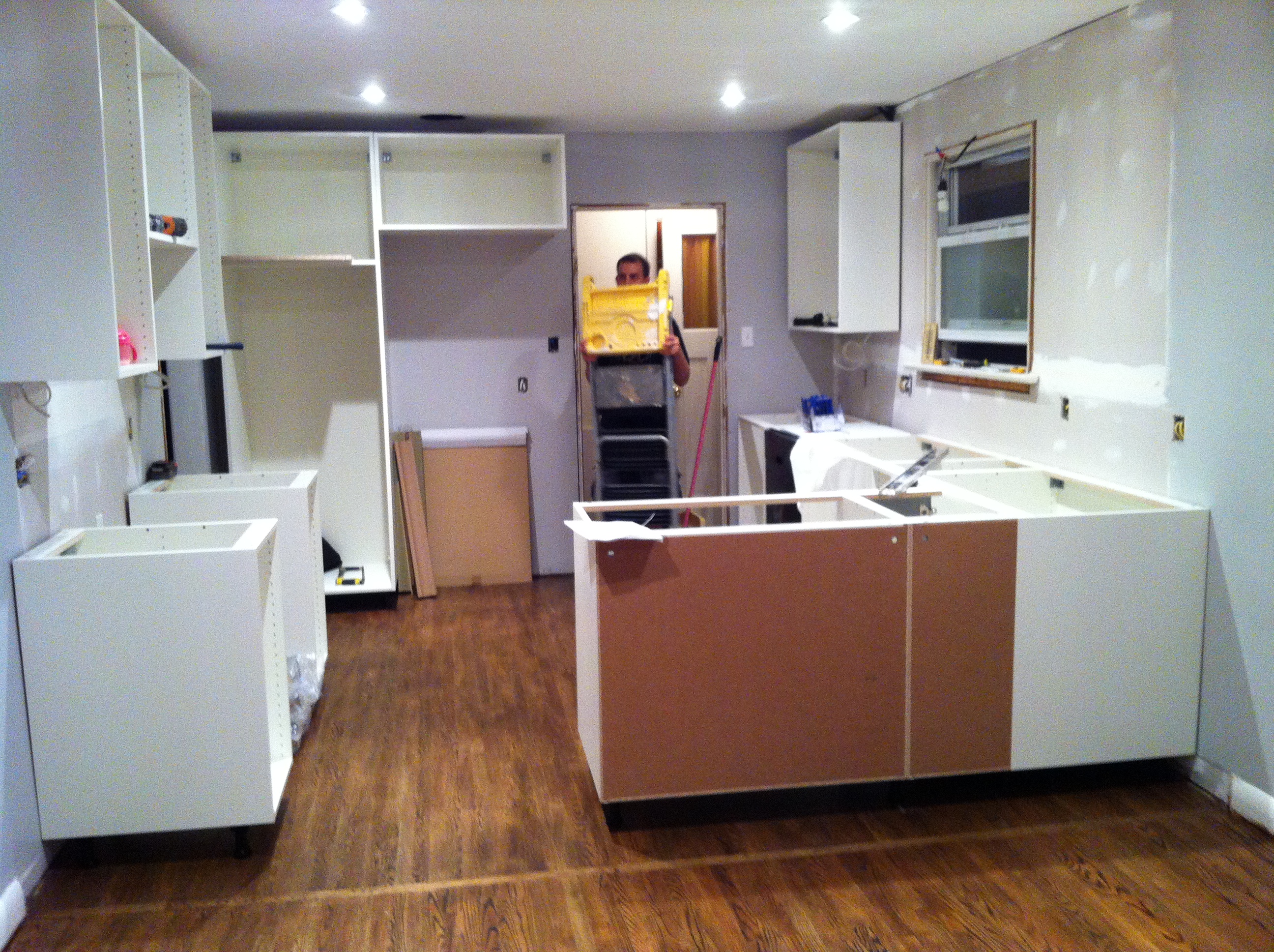The next steps are when the kitchen really starts taking shape as a kitchen so I will just take a couple minutes to talk about the kitchen cabinets.  We decided to go with Ikea cabinets.  If you know me personally at all, you will know that I am thrifty (otherwise known as cheap) and that I excessively research large purchases (which to me is anything over $100).  I read countless reviews about the value of ikea cabinets.  The only recurring complaint I could find was that there are limited box sizes, which ended up being no trouble for us when using the ikea kitchen planner.  Otherwise, the reviews stated that in terms of pre-fab euro-box style cabinets (as opposed to custom face frame or something else custom) Ikea cabinets held up very well and that features such as soft-close doors and drawers were included as standard.  Additionally their hardware is all Blum which is a very reputable hardware manufacturer used in higher end cabinets.  As far as the doors and cabinet bases which are manufactured by Ikea go, they include a 25 year warranty.  I also felt that Ikea, in comparison to any of the big box stores had the nicest looking selections.  All this being said, our biggest deciding factor on kitchen cabinets was price.  I would have loved the look and quality of custom cabinets with real wood boxes and solid wood doors, but the reality of the situation was that our budget was in the neighbourhood of $5000.  Not $40,000.  Not even $15,000 or $9,000.  And it was very realistic to work in that neighbourhood while using Ikea cabinets.  We purchased them during a kitchen sale and we ended up using the gift cards we received to buy our interior fittings and bathroom vanity.  Included in our order was an integrated dishwasher, over the range microwave, sink, faucet and the pulls(but not the knobs which we purchased from Overstock).