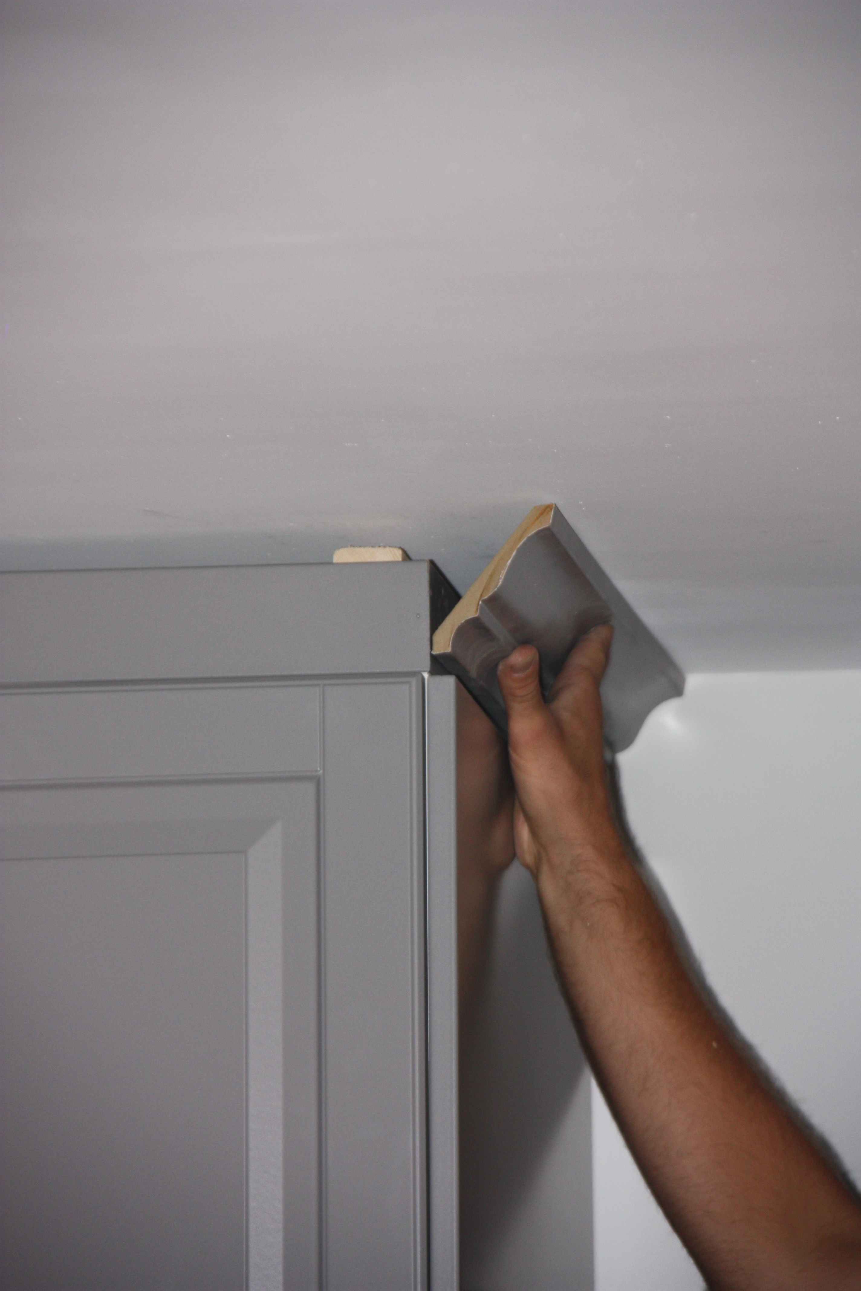 Anyway, after finding out the house sold, we pressed on with the kitchen.  Next up was the finishing touches.  Aaron did all the trim work himself and I am so proud of how great a job he did!  The kick and the moulding at the bottom of the uppers that covers the under cabinet lighting did come from Ikea but the crown and all the moulding on the back and ends of the base cabinets just came from Rona and we painted them a custom matched colour from Benjamin Moore.  Doing this instead of buying Ikea’s panels and/or door fronts to use decoratively saved us hundreds of dollars.  I wanted big crown because I like the substantial look of it but also because we were making our cabinets look built in right to the ceiling and we needed big crown to do that.  Here are a couple pictures of process.  To fill the gap between the bottom of the crown and the top of the cabinet, we used a flat piece of trim painted the same grey.  This also gave a solid surface to nail the crown to.