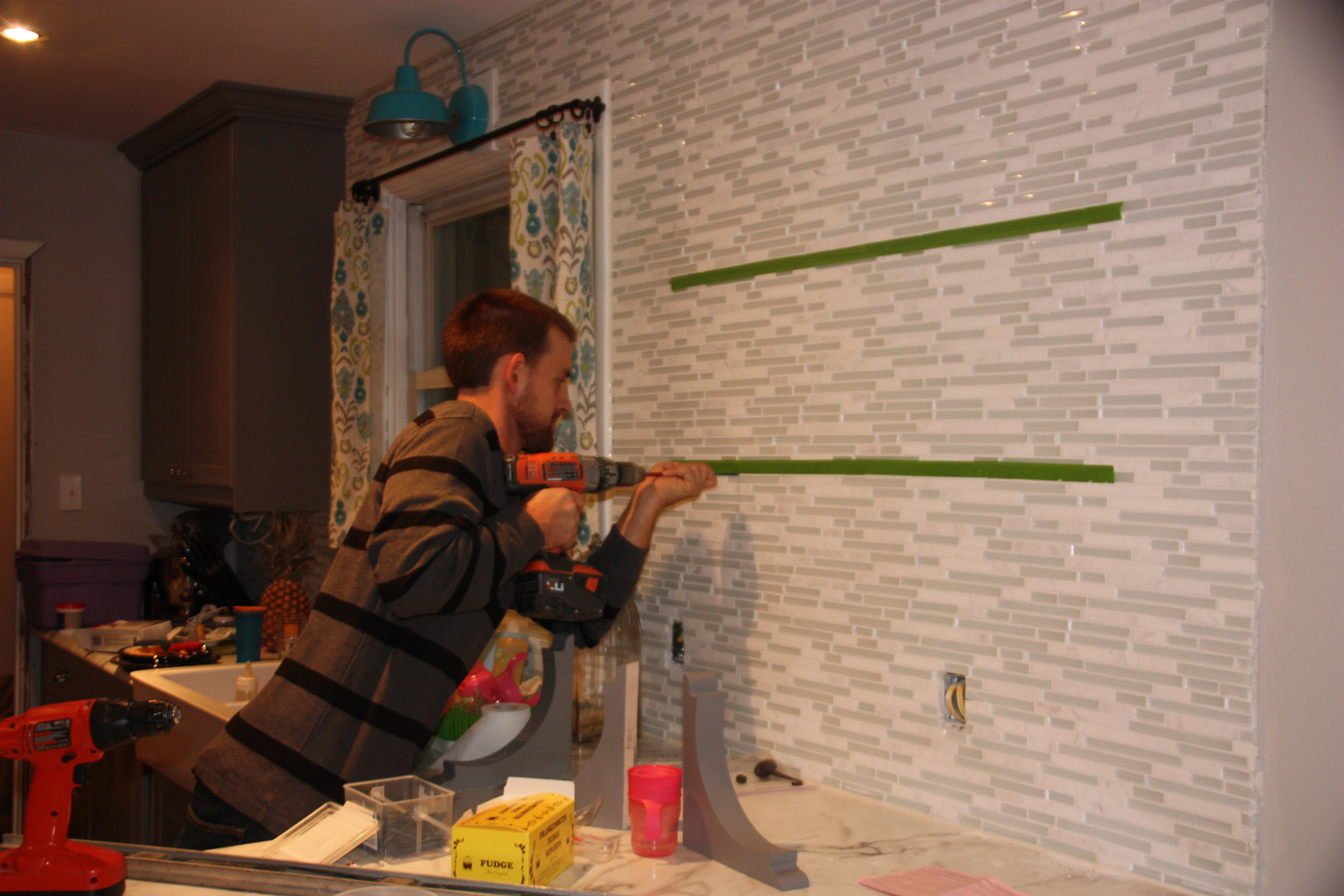 After we got the tile up, we put our open shelving up.  We opted not to put another cabinet on the right side of the sink because we felt that it would really box in the kitchen and be a big bulky eyesore while sitting near the wall at the peninsula.  I also really like the look of open shelving and it seems functional for dishes and glasses that you use everyday as well as providing a place to display some colourful serving dishes etc.  We purchased brackets for the shelves in the states at Home Depot because they don’t carry them at the Canadian store.  They were $10 each and we used them as countertop support on the peninsula as well.  Aaron could have made something but I liked the shape of these and they were wood and a good thickness.  ImageImageImage