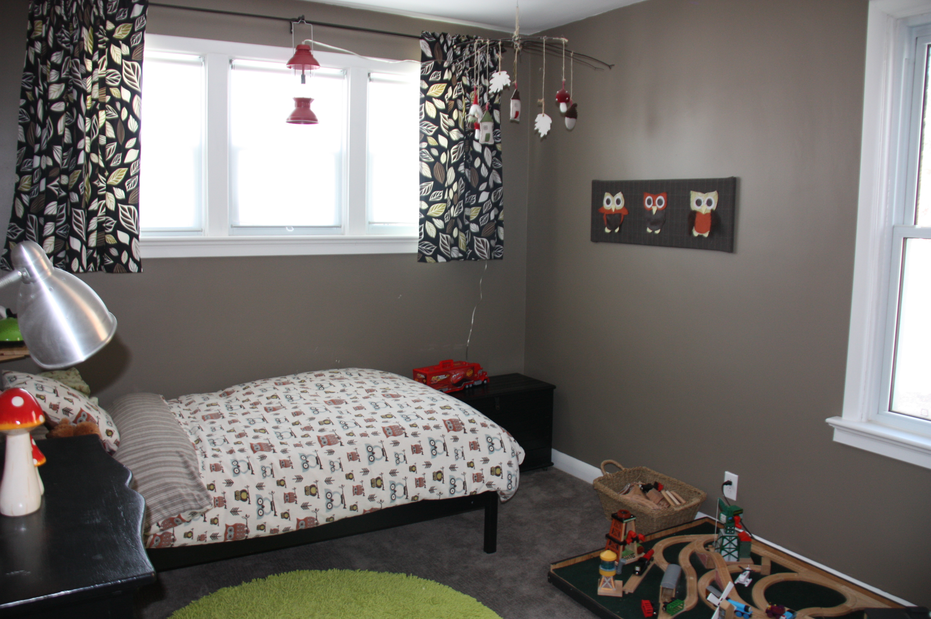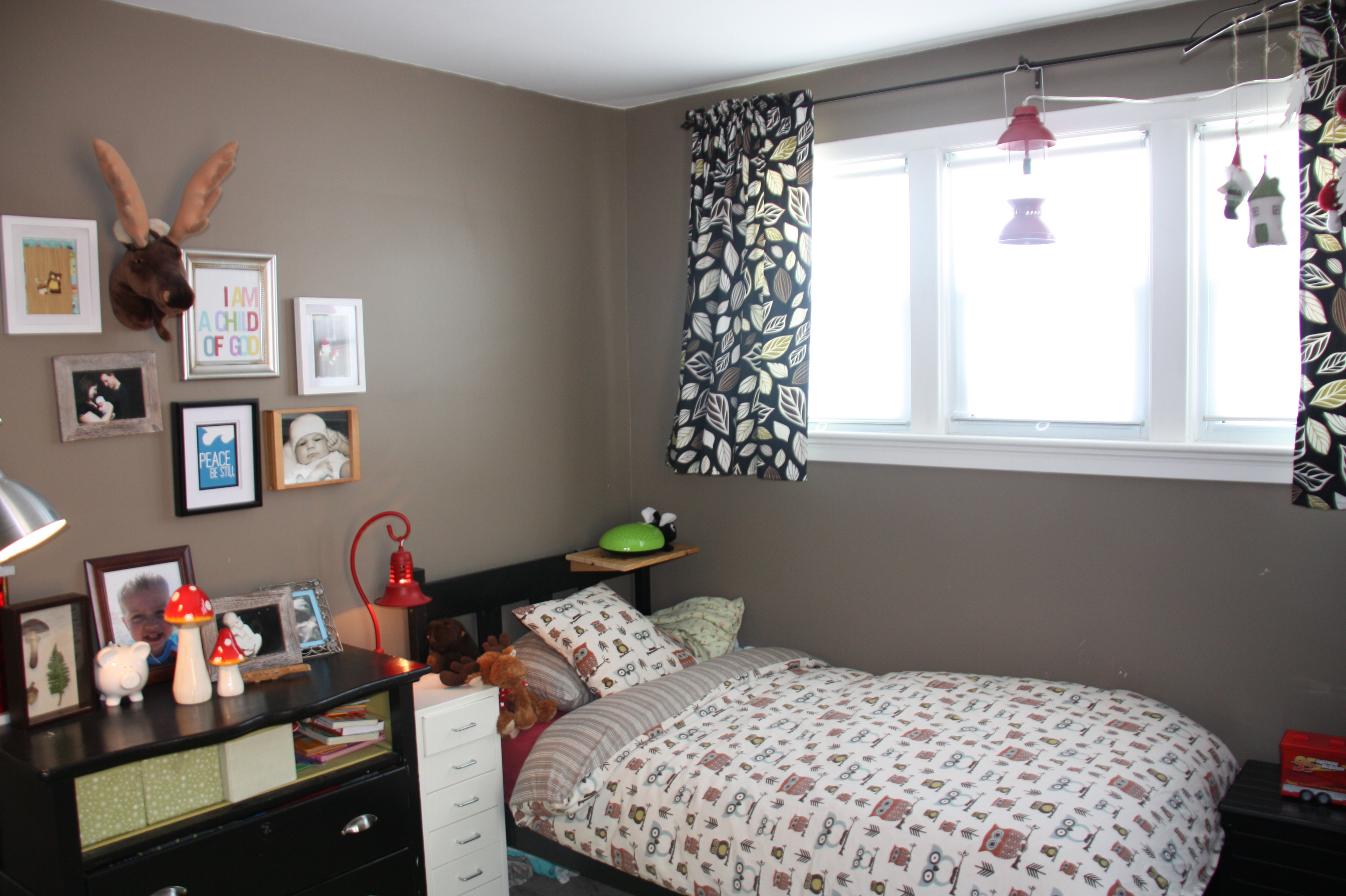 The colour is Benjamin Moore Kingsport Gray, although I would say it looks less grey and more brown. I chose it based on his bedding and curtains from the old house. I loved the green in his old room, but it was taking a beating in the dirt department, so I thought I would switch it up to something that would handle the dirt issue better. It also ended up matching the carpet perfectly which was not planned. We went to choose carpet at a wholesale place and found some ends in a colour and pattern we liked. It is a cut and loop pile with a sort of random pattern and after (only) 5 months is holding up really well. We bought the ends knowing we couldn’t return them and already had the cans of paint at home, so we were very pleased when we brought them home to see they were a perfect match. I’m not usually a matchy person, but for a kid’s room where there is a lot going on already, a neutral background is kind of nice. Everything in the room was from his old room so I have probably talked about most of it before. Oh except the moose head! That was a great find on a local buy and sell group. And I shortened the curtains. I prefer the look of long curtains but the bedrooms are small enough that the only option will be to keep furniture pushed up against the walls and pulling curtains shut behind the bed or a dresser every night would be a huge pain, so I chopped them off. We also replaced the old venetian blinds with some light filtering blinds from Ikea.