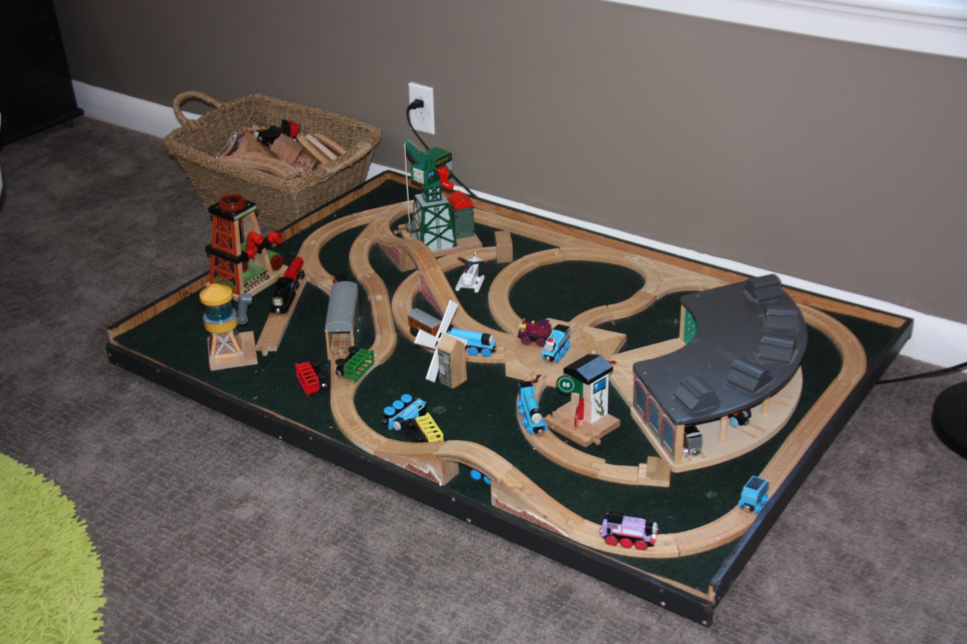 Here is Myles’ train table. We bought it used on Kijiji a couple of years ago. It had legs, but Aaron recently took the legs off and put castors on the bottom. The room is small and this way it can get tucked under the bed if it needs to. He also flipped one of the sides down on it so that other tracks can attach and it can be extended off the table onto the floor.