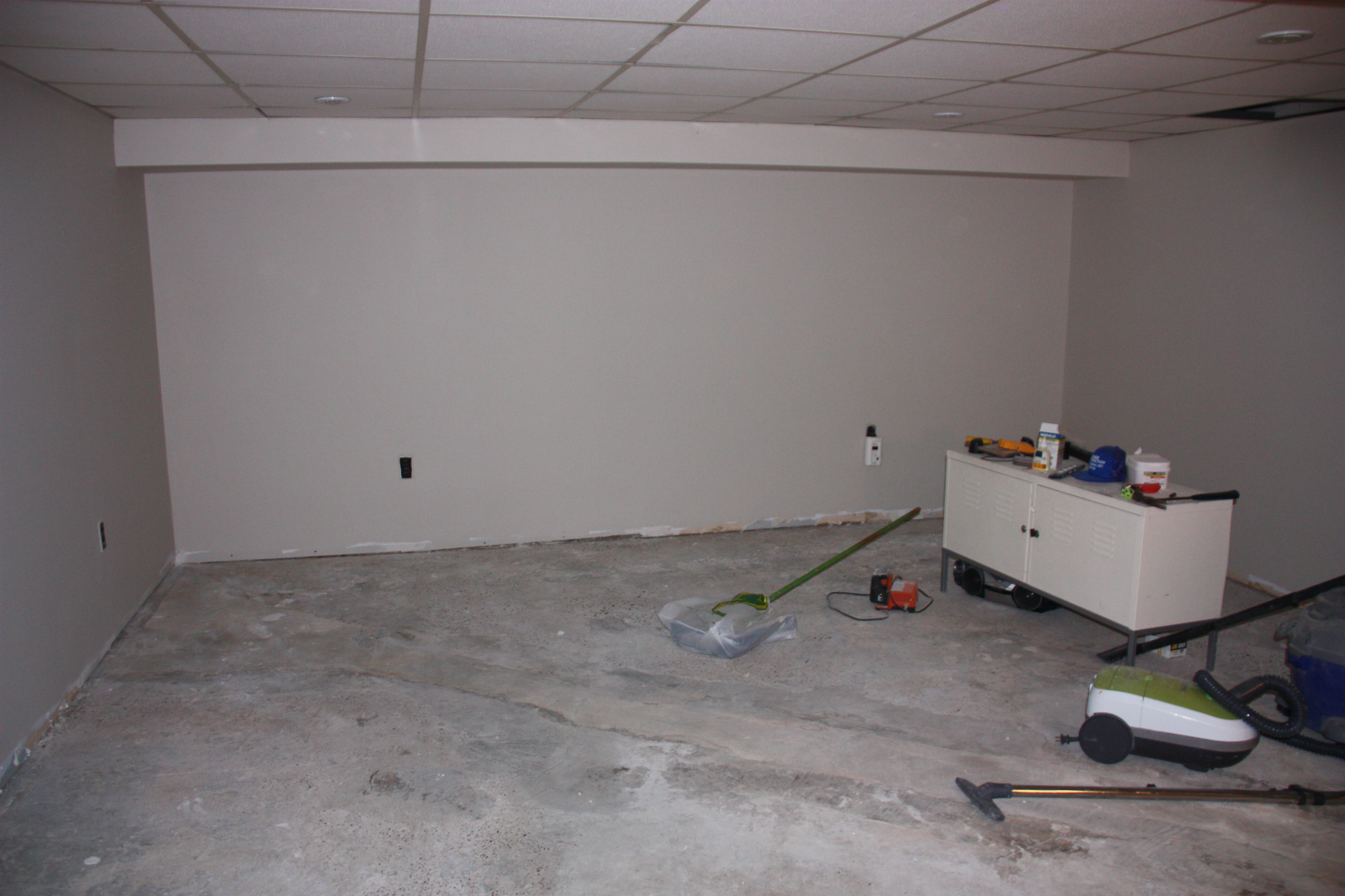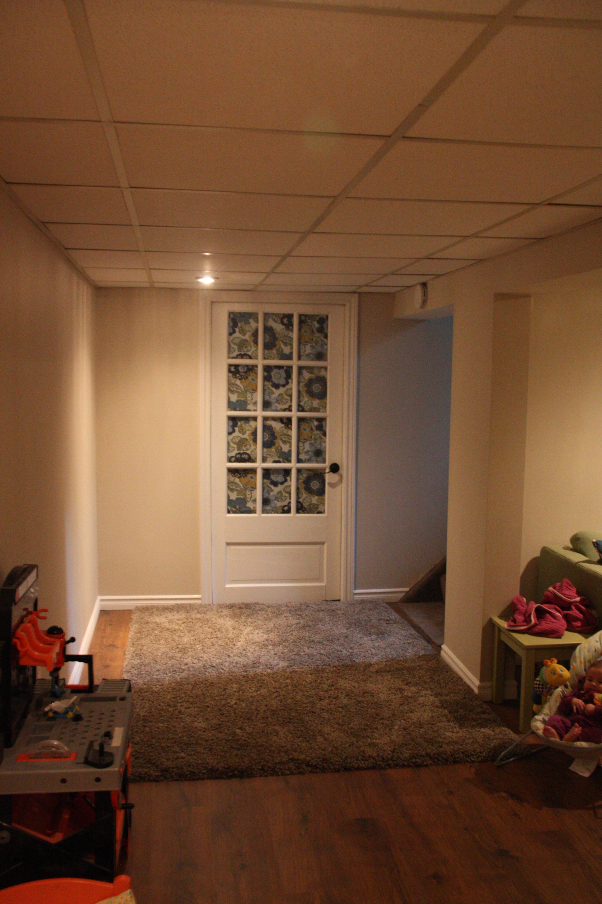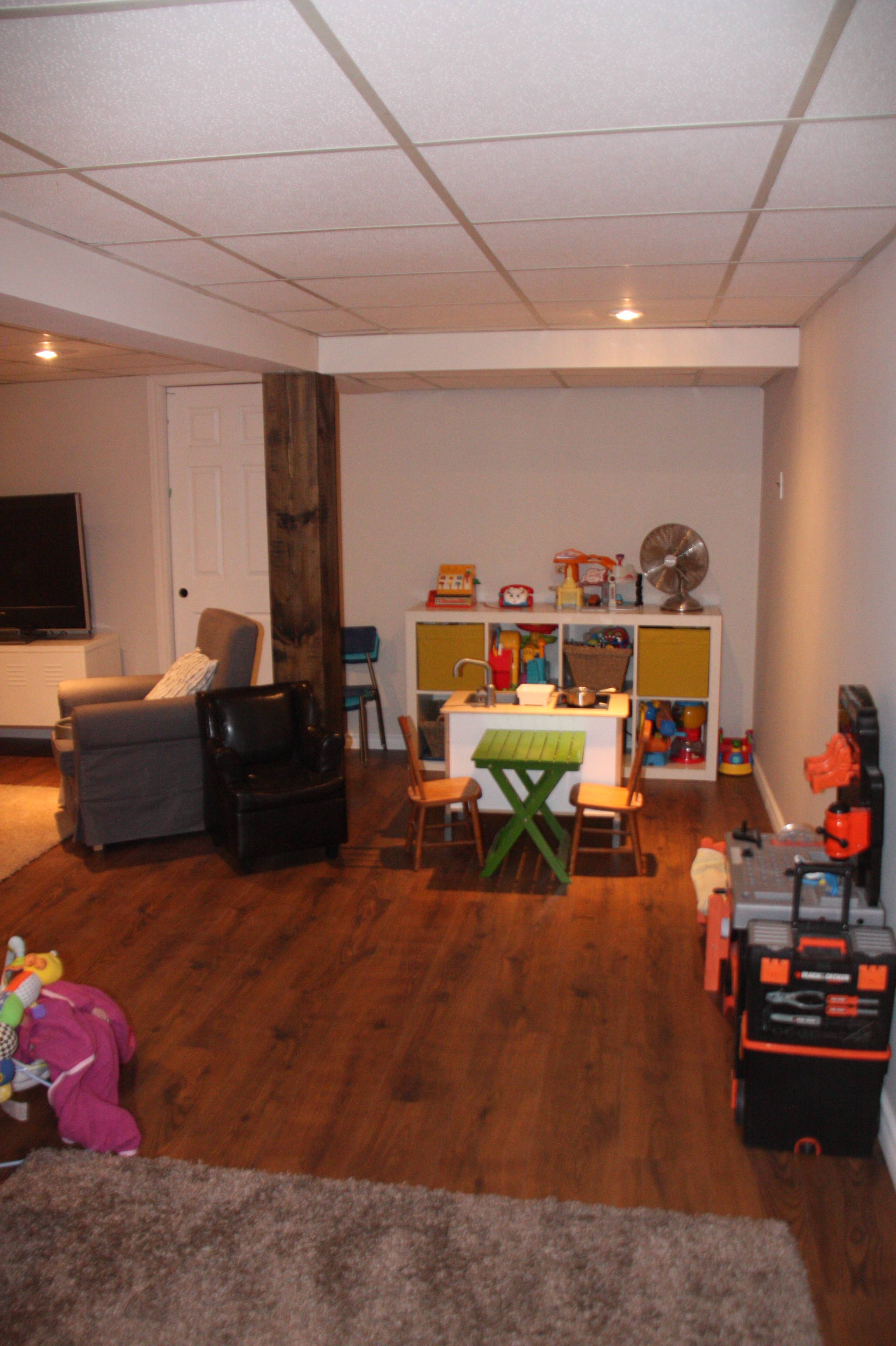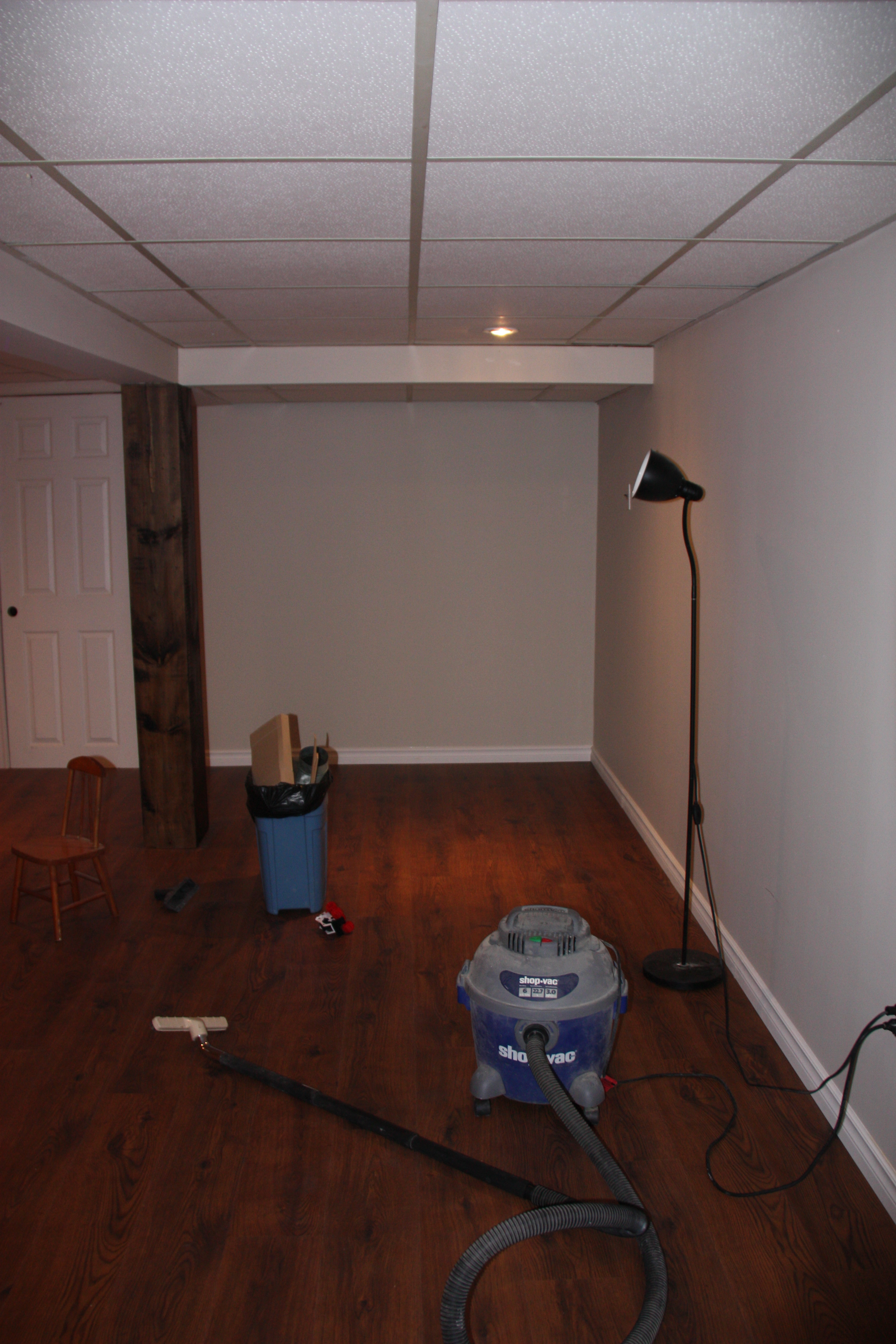 We did things as cheaply as possible since this will be a family room/play room that will be used by children and we anticipate it looking used with time. Additionally, we are not willing to go into any debt aside from our mortgage so if we wanted to finish this space we needed to be able to cash flow it. The ceiling tiles came from a buy and sell group(the person had bought all of the tiles from a Zellers that closed) and we paid $100 for all of them. The paint is Benjamin Moore Aura Bath and Spa which is awesome stuff because it is mildew resistant, has a matte finish and is washable! It is EXPENSIVE paint but I had a loyalty card from our local Ben Moore and we bought all of the paint for our house(in the cheaper contractor grade) so I had a free can waiting for me. I did purchase the second can(it was on sale) which brought the total for paint to $75. The mud and drywall(just a few pieces to patch in was around $100, the wood was around $100. Our floor was on sale for $0.66 a sq. ft which made it around $300 plus $150 for the air gap system that goes underneath it. Trim and other odds and ends probably brought us up to around $1000 total. That always seems to be a goal of ours, “let’s keep it under a grand”. This isn’t the Taj Mahal, but we are looking forward to some more usable space :).