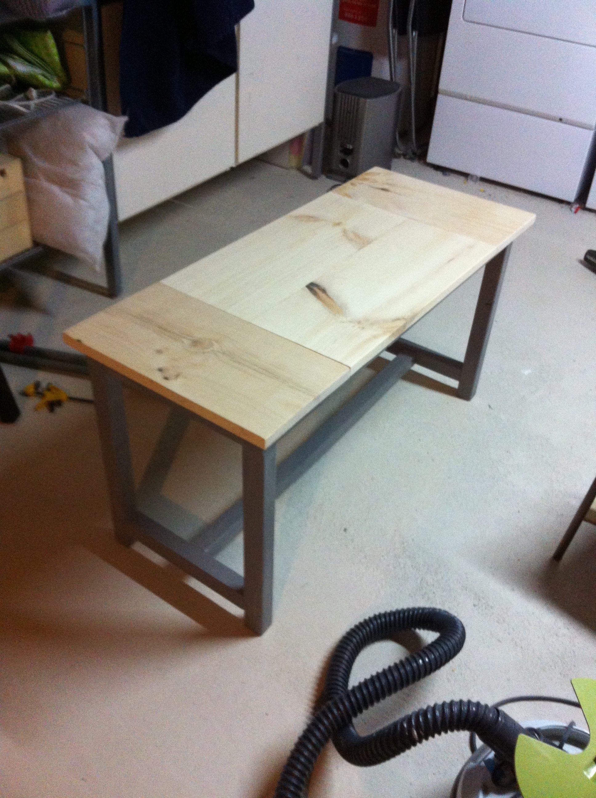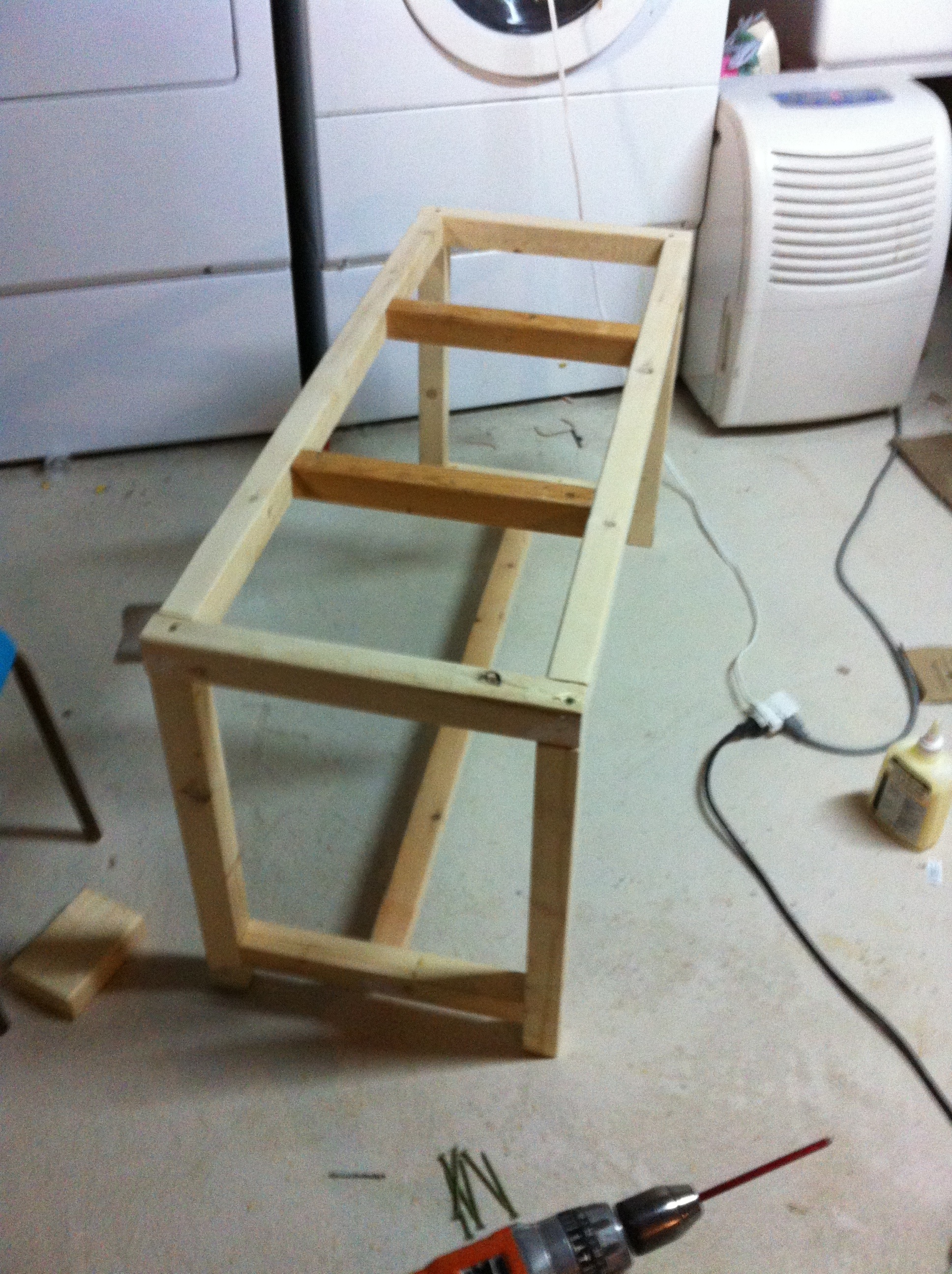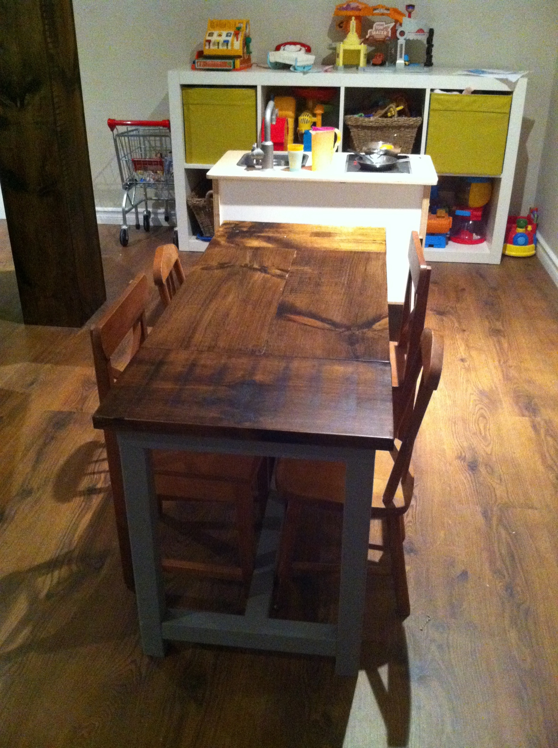 After we completed the basement on the weekend I was cleaning up some scrap and came across the cut offs from our pine boards that we faced the column with. I have been looking for a tall enough coffee table to transform into a kids play table but hadn’t found what I was looking for. When I saw these chunks sitting around the light went off that I could just make the table. We built a harvest table for Aaron’s sister a little while ago so I had the general idea of how we constructed it, I would just need to scale everything down. So that night I found a 2×4 and marked up my wood for Aaron to make my cuts. I probably could have handled the chop saw but the 2×4 needed to be ripped lengthwise and I didn’t feel comfortable doing that on the table saw. He did all my cuts for me in a half hour or so. The next morning I sanded all my pieces and started assembling. I didn’t use any fancy joinery techniques like when we built the full scale table, just predrilled holes and countersunk screws then put putty in the holes. I knew I was painting the base so all that would be covered up. After I assembled the base I screwed the top onto it from the underside. Then I gave a final sanding to everything and painted the base. Then I stained the top with minwax dark walnut. Once that was dry I used a satin poly to seal it all. I did three coats. What a fun little project this was! It’s “rustic” so it didn’t have to be perfect, it only took a few hours of actual work time and the best part, it was free!