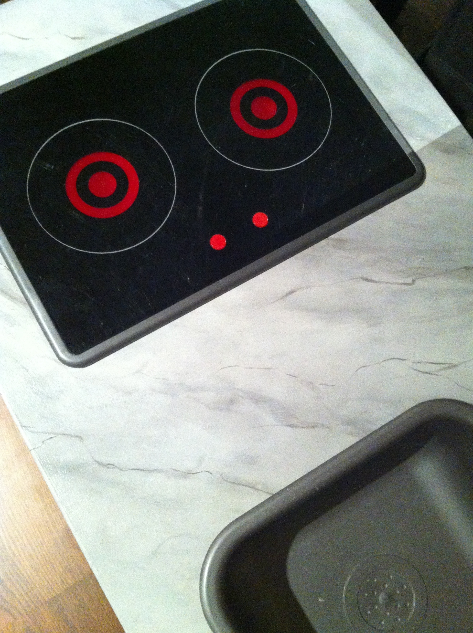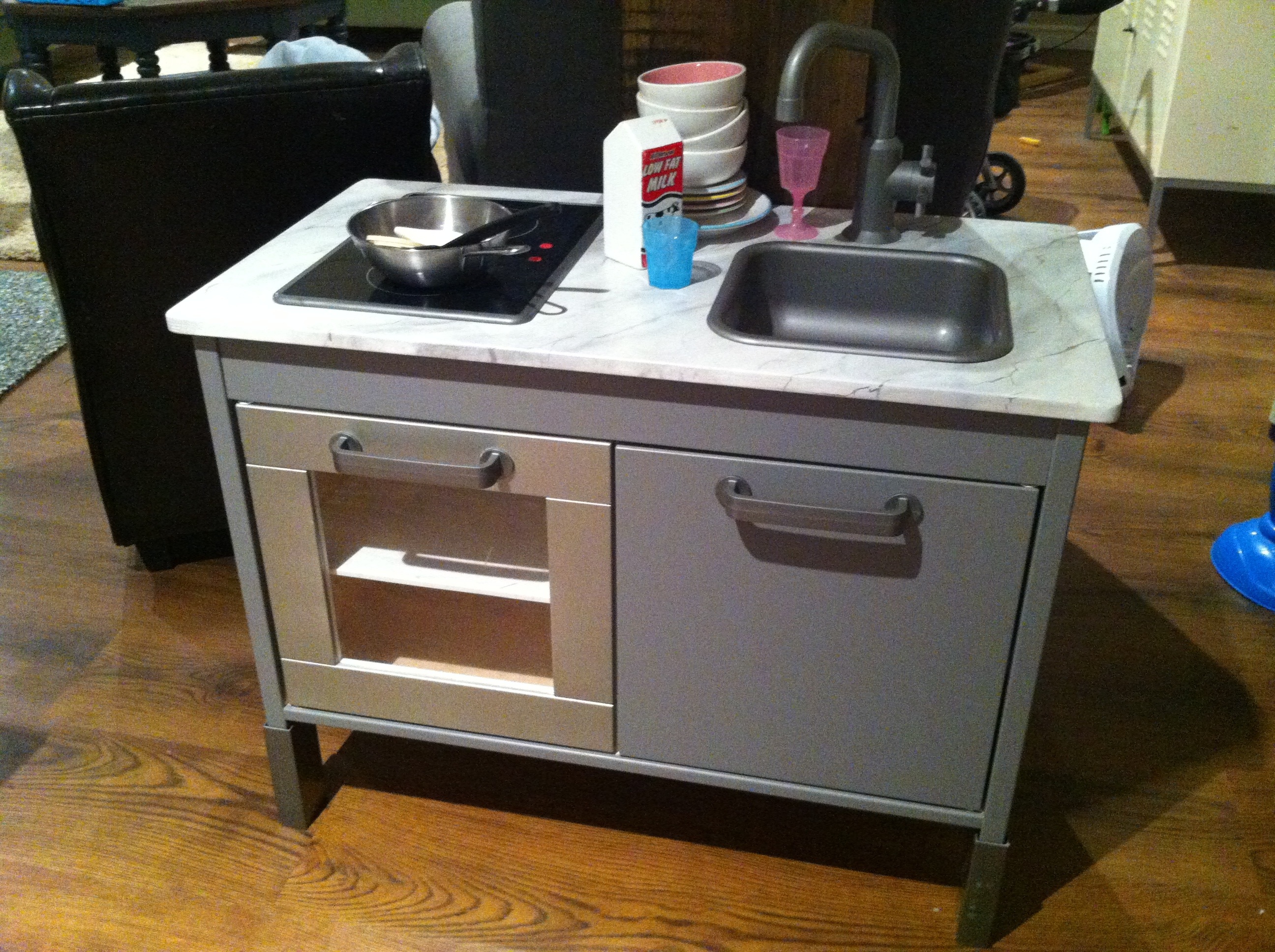 I can’t leave well enough alone. My sister gave Myles the duktig play kitchen from Ikea for his first birthday and the kids have spent a fair amount of time playing with it, especially now that the two of them can play with it together. I started looking up duktig makeovers and decided I wanted to make the kids’ kitchen match our real kitchen. So I painted the base the same grey paint we used in our kitchen and I found this tutorial for faux marble and used it to transform the countertop. It was so much fun, I forgot how much I enjoy painting, not just painting the walls. The kitchen is so cute and now it matches the harvest table.