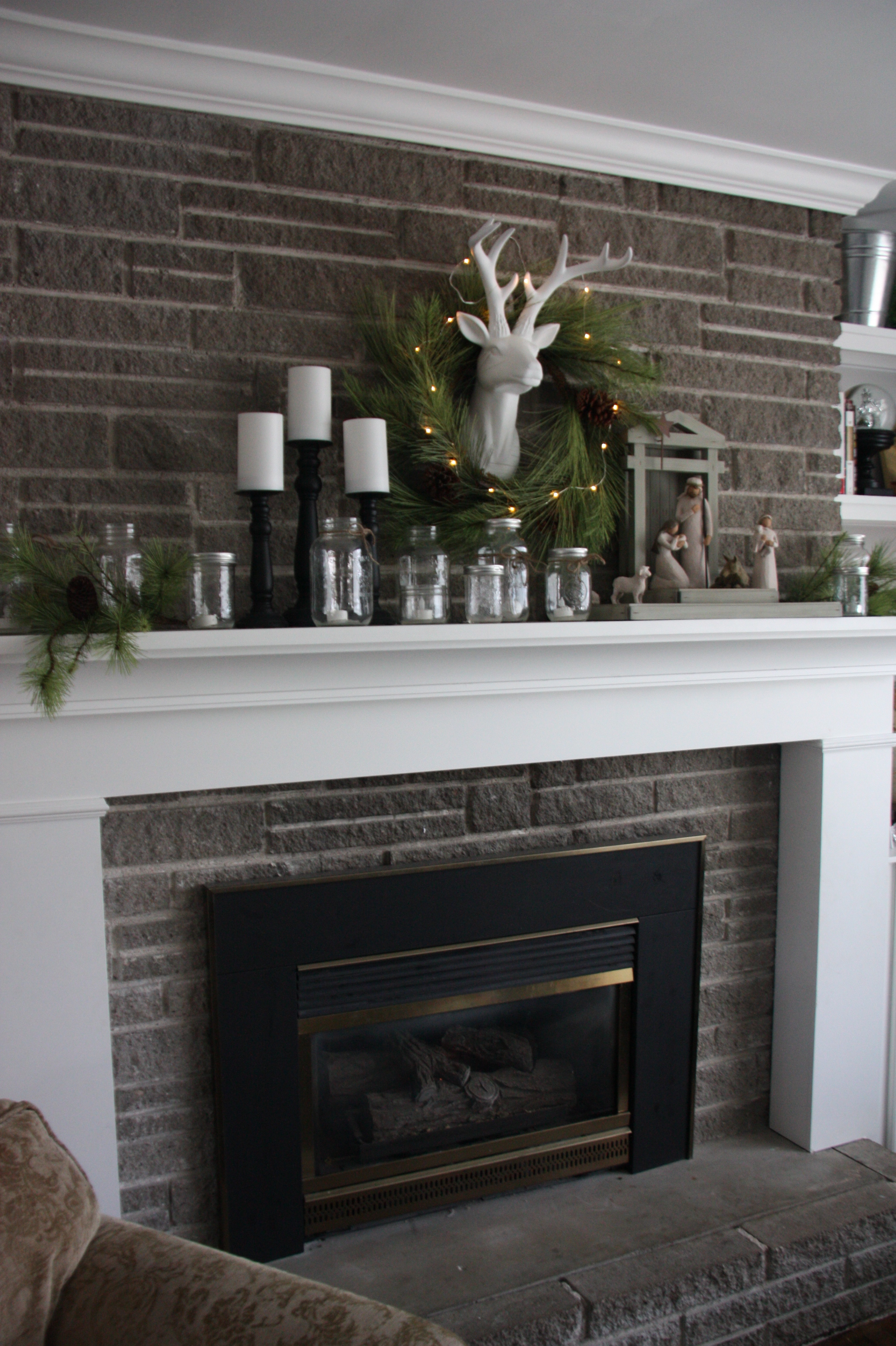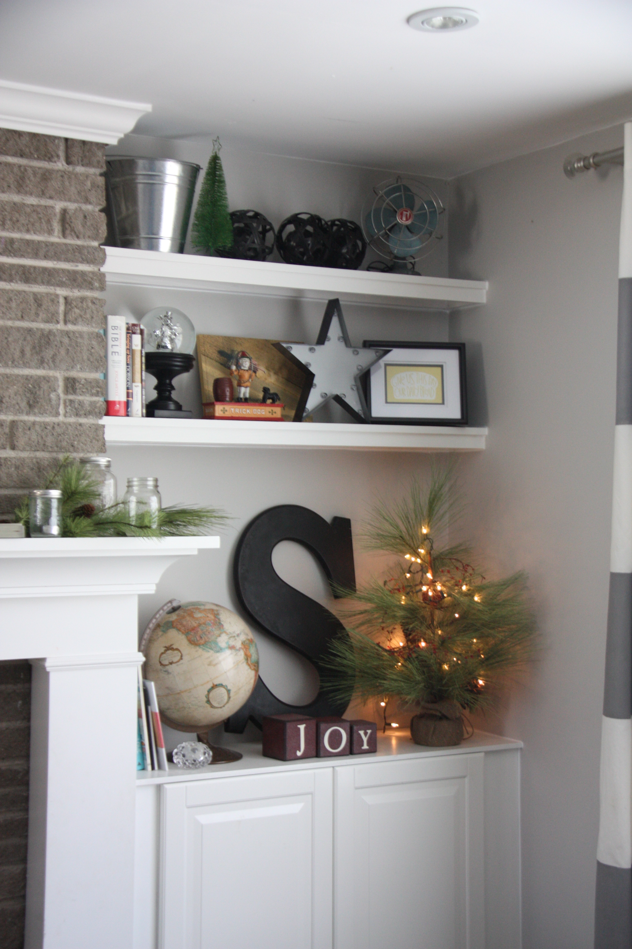 We finally got around to putting some shelves up on either side of the fireplace and it really finishes it off. We built them out of pine boards and then I painted them white. Aaron also finished the caulking along the top of the crown moulding and I puttied nail holes and painted and it looks so much better now. We finished it all in the nick of time to decorate for Christmas!