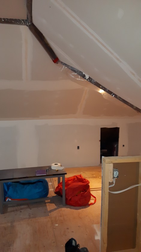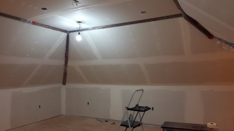 And this is where things are at now after Aaron built the knee walls, hung the drywall and finished the first coat of mud.